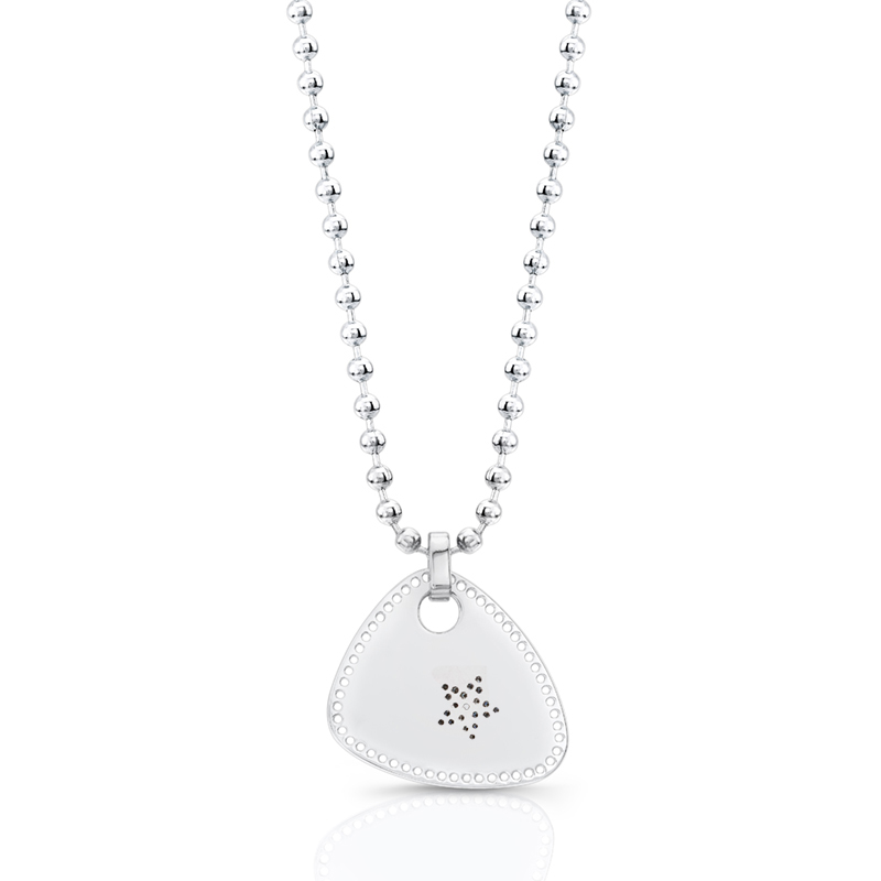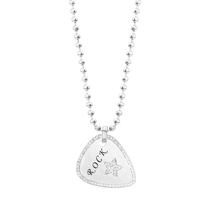 Made in either 925 sterling silver or 14 karat white gold this ROCK STAR guitar pick pendant features a white diamond border and white star with black rhodium engraving  (0.91ct total weight).